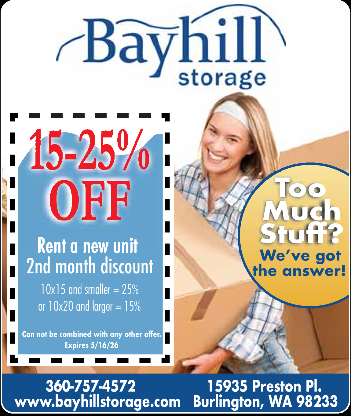 15-25% OFF! Rent a new unit - 2nd month discount! 10x15 and smaller = 25% or 10x20 and larger = 15%