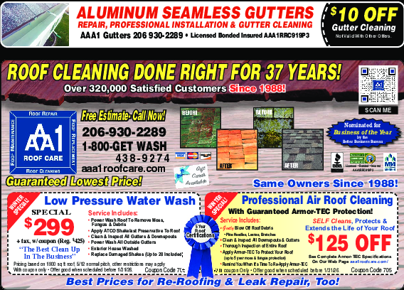 See Complete Armor-TEC Specifications On Our Web Page aaa1roofcare.com. Service Includes: Gently Blo...Morew Off Roof Debris (Pine Needles, Leaves, Branches). Clean & Inspect All Downspouts & Gutters. Thorough Inspection of Entire Roof. Apply Armor-TEC To Protect Your Roof (up to 5 year moss & fungus protection). Remind You When It's Time to Re-Apply Armor-TEC. With coupon only. Offer good when scheduled before 1/31/26. Coupon Code 705 Less