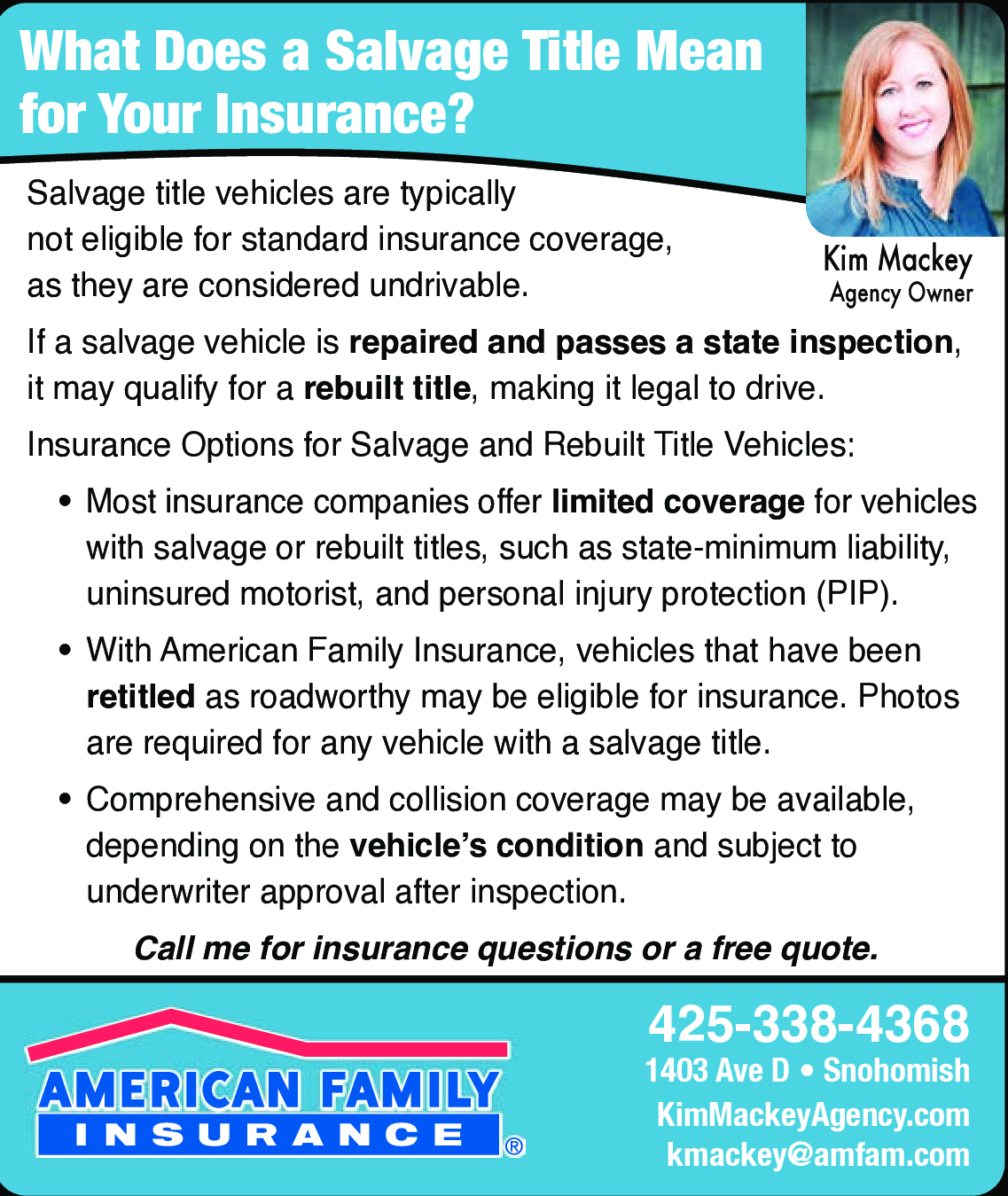 Call me for insurance questions or a free quote! 425-338-4368