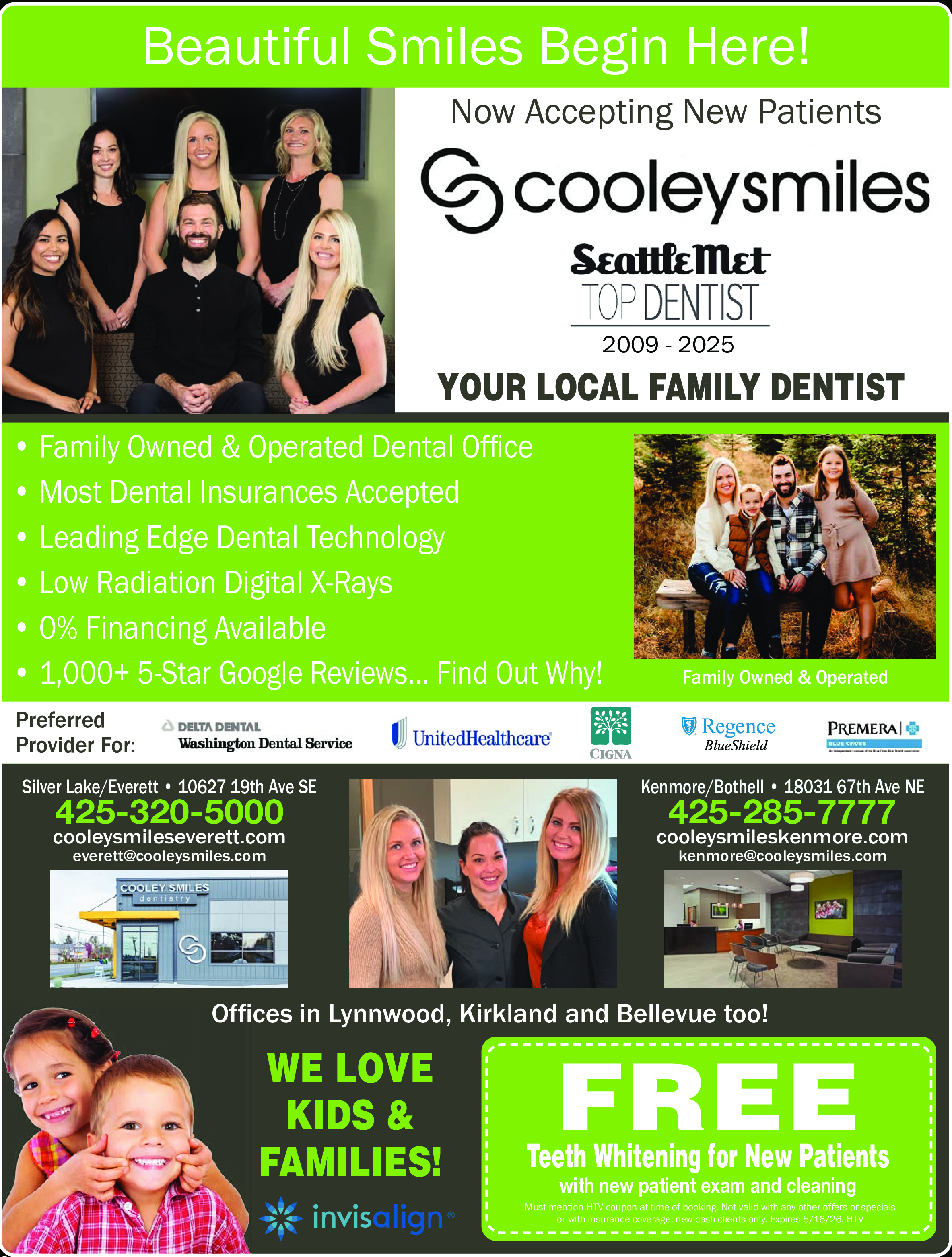 Named Top Dentist by Seattle Met, Cooley Smiles is a family owned and operated office with hundreds of 5-Star Google Reviews!