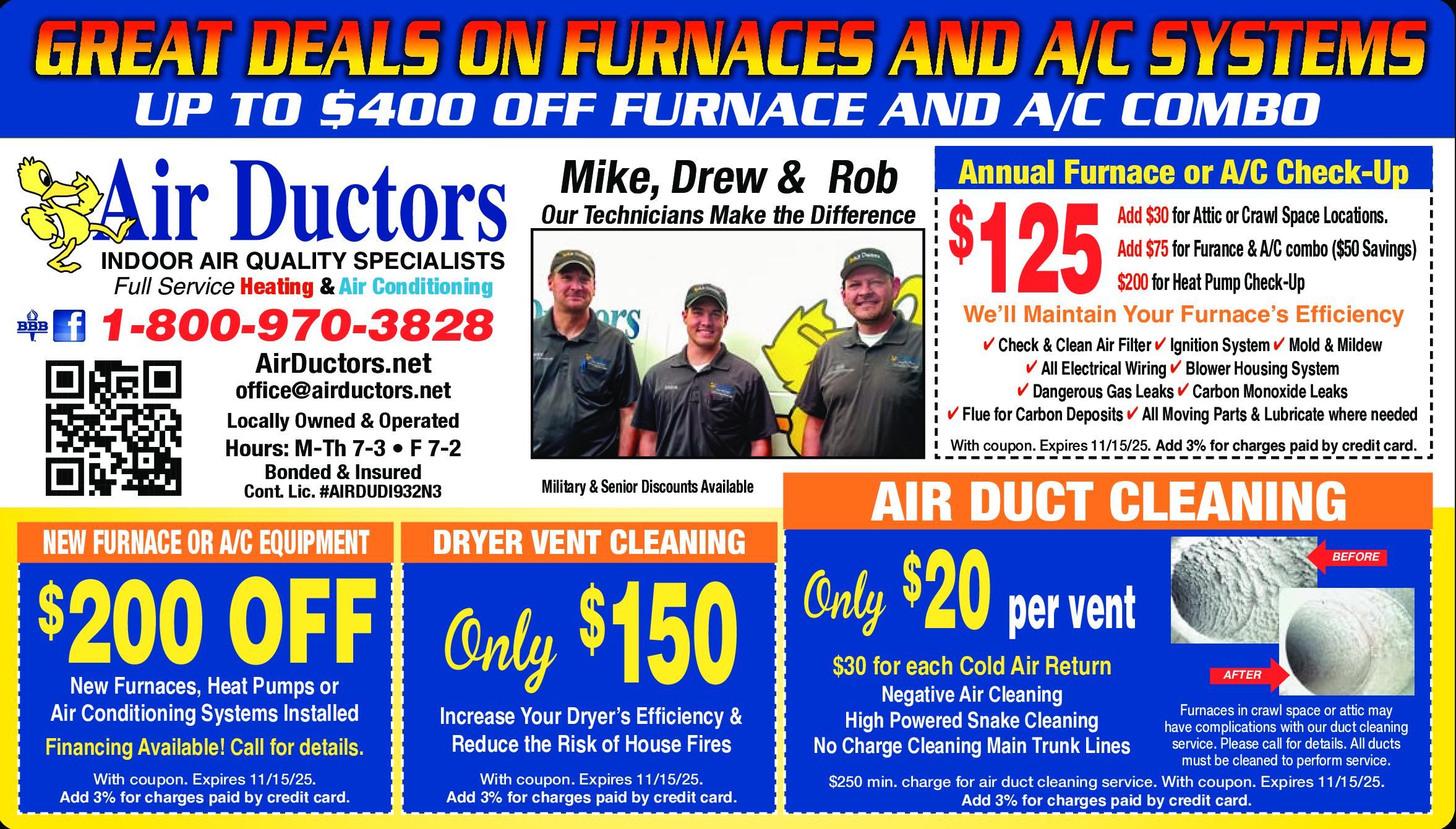 Annual Furance or A/C Check-Up $125 - Add $30 for Attic or Crawl Space Locations - Add $75 for Furnace & A/C Combo ($50 Savings) - $200 for Heat Pump Check-Up