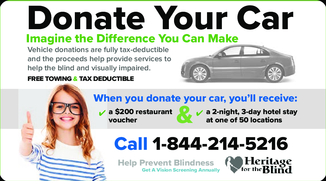 When you donate your car, you'll receive a $200 restaurant voucher and a 2-night, 3-day hotel stay at one of 50 locations! Call 1-844-214-5216!