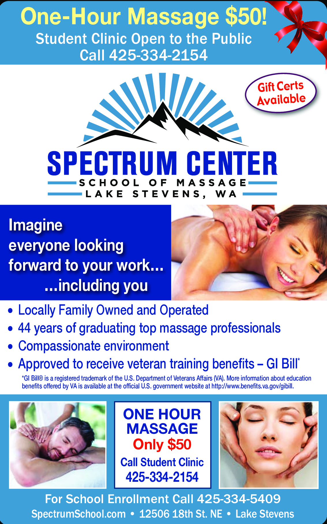 One Hour Massage $50! Call Student Clinic at 425-334-2154