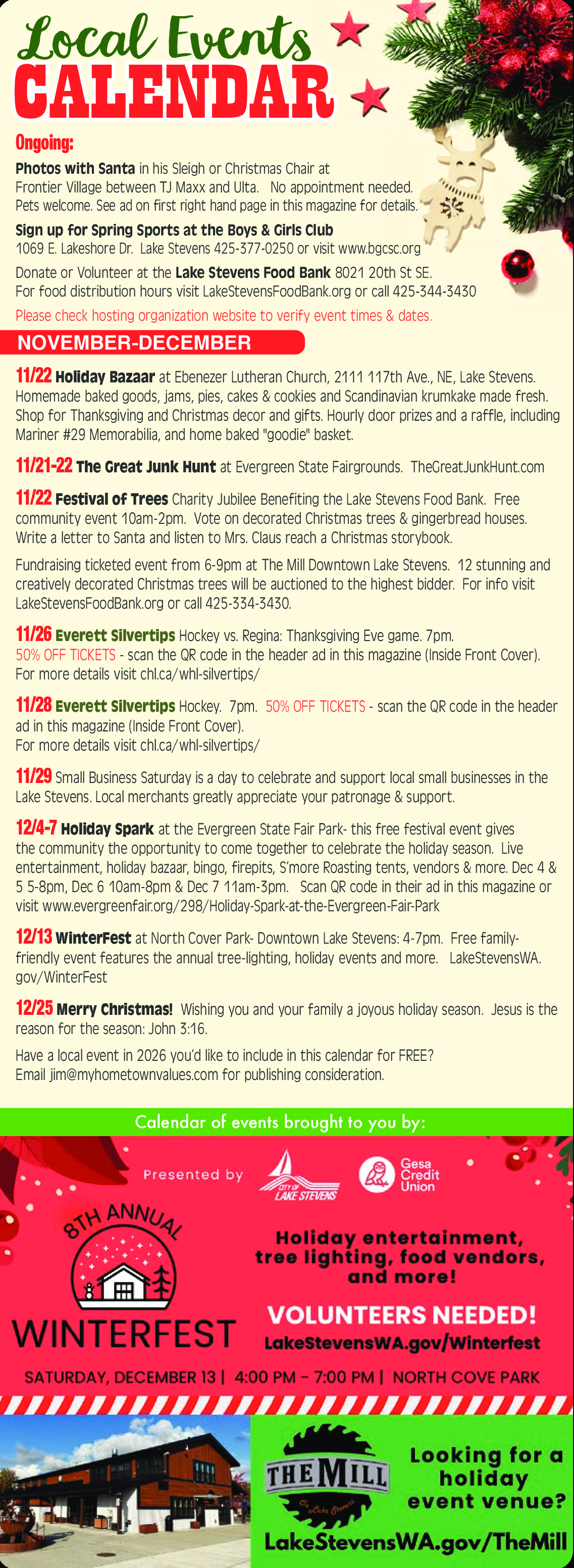 Looking for a holiday event venue? Visit LakeStevensWA.gov/TheMill