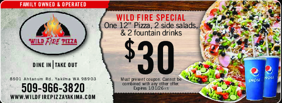 Wild Fire Special! One 12-in Pizza, 2 Side Salads, & 2 Fountain Drinks $30