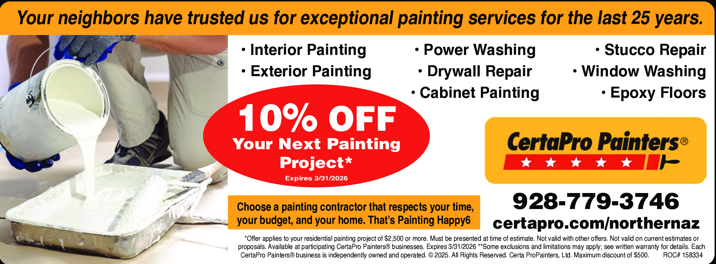 Expires 3/31/2026. *Offer applies to your residential painting project of $2,500 or more. Must be pr...Moreesented at time of estimate. Not valid with other offers. Not valid on current estimates or proposals. Available at participating CertaPro PaintersA® businesses. Expires 3/31/2026 **Some exclusions and limitations may apply see written warranty for details. Each CertaPro PaintersA® business is independently owned and operated. A© 2025. All Rights Reserved. Certa ProPainters, Ltd. Maximum discount of $500. ROC# 158334 Less
