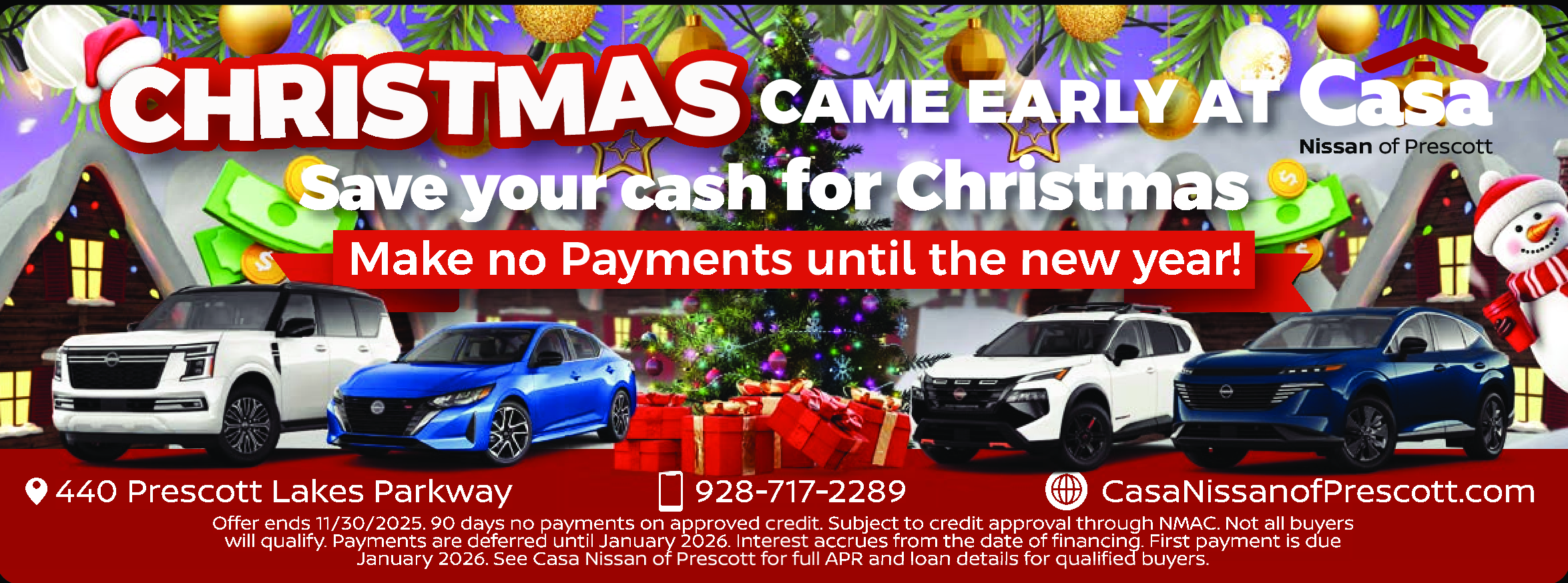 Offer ends 11/30/2025. 90 days no payments on approved credit. Subject to credit approval through NM...MoreAC. Not all buyers will qualify. Payments are deferred until January 2026. Interest accrues from the date of financing. First payment is due January 2026. See Casa Nissan of Prescott for full APR and loan details for qualified buyers. Less
