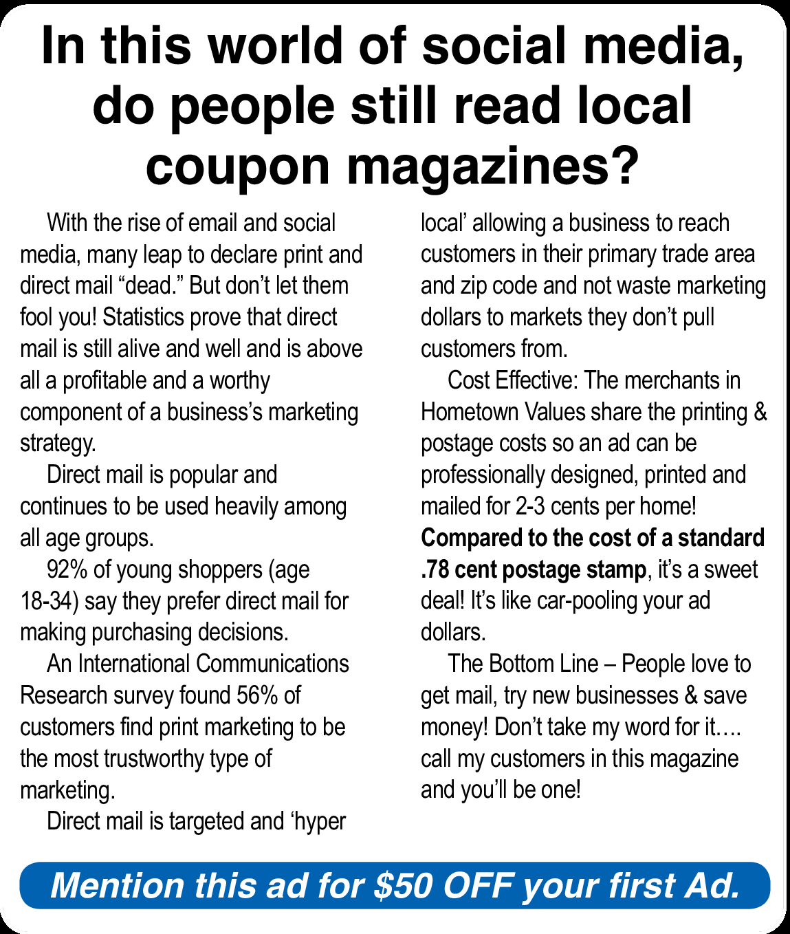 Mention this ad for $50 OFF your first ad