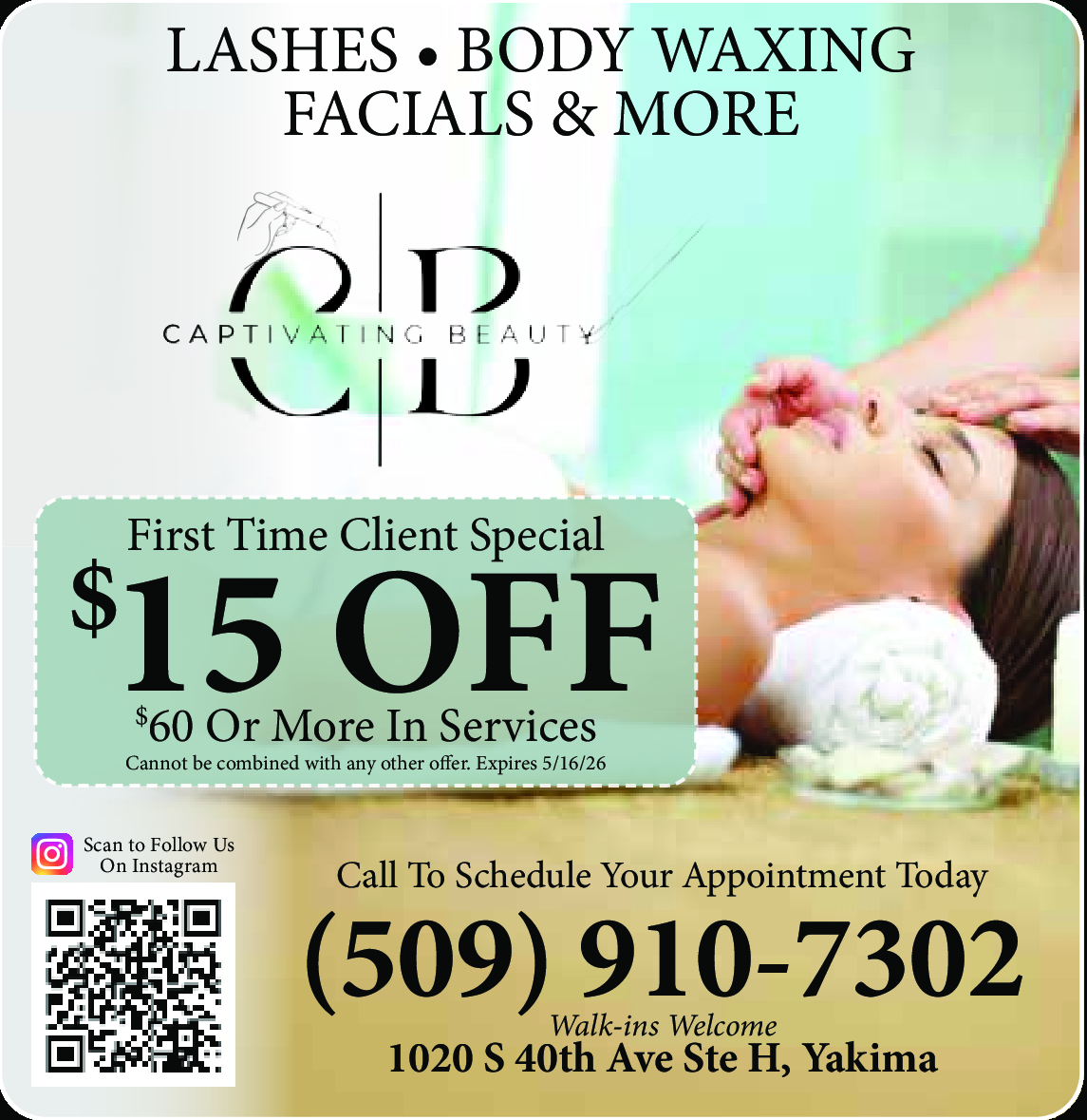 First Time Client Special. Cannot be combined with any other offer. Expires 5/16/26.