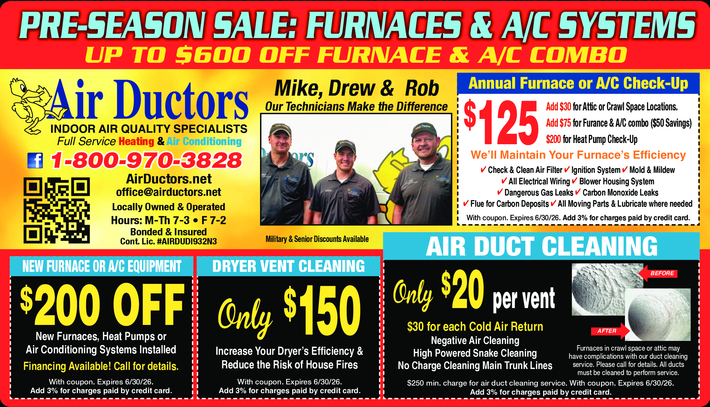 Annual Furance or A/C Check-Up $125 - Add $30 for Attic or Crawl Space Locations - Add $75 for Furnace & A/C combo ($50 Savings) - $200 for Heat Pump Check-Up