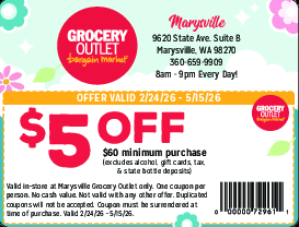 Excludes alcohol, gift cards, tax, and state bottle deposits. Valid in-store at Marysville Grocery O...Moreutlet only. One coupon per person. No cash value. Not valid with any other offer. Duplicated coupons will not be accepted. Coupon must be surrendered at time of purchase. Valid 2/24/26 - 5/15/26. Less
