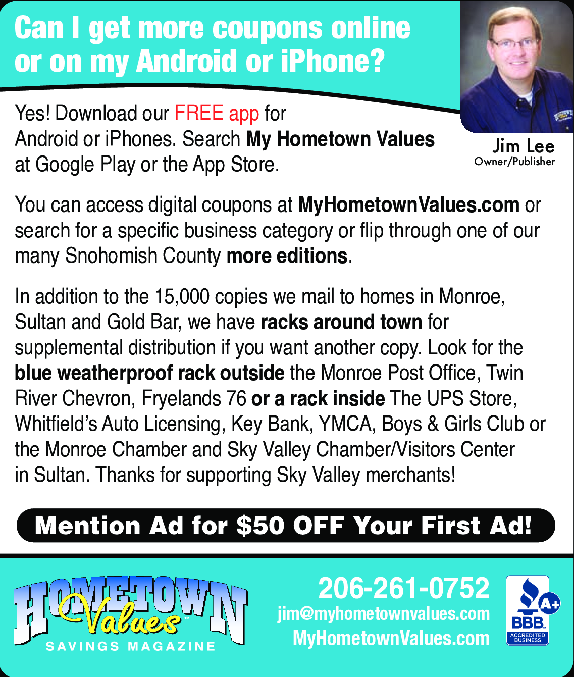 Mention Ad for $50 OFF Your First Ad! Call Jim at 206-261-0752!