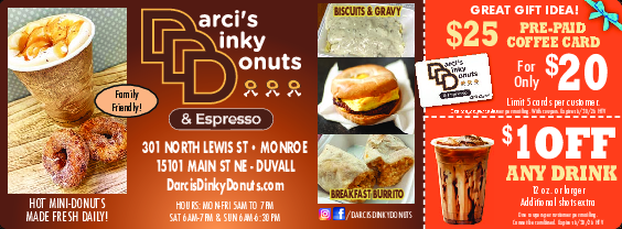 Monroe's favorite espresso stand for drinks, hot mini-donuts, bakery items, biscuits and gravy and energy drinks.