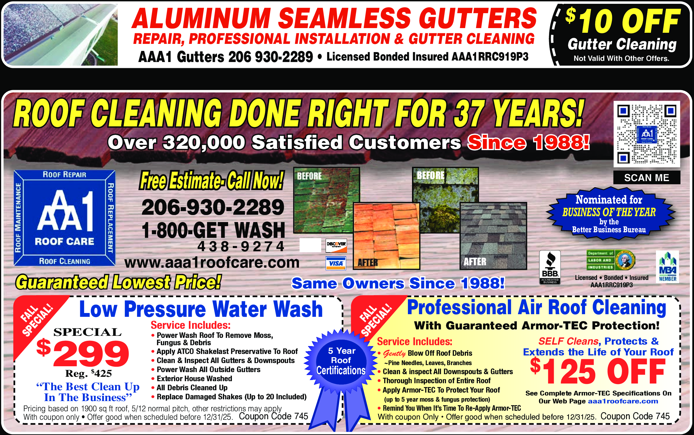 See Complete Armor-TEC Specifications On Our Web Page aaa1roofcare.com. Service Includes: Gently Blo...Morew Off Roof Debris (Pine Needles, Leaves, Branches). Clean & Inspect All Downspouts & Gutters. Thorough Inspection of Entire Roof. Apply Armor-TEC To Protect Your Roof (up to 5 year moss & fungus protection). Remind You When It's Time to Re-Apply Armor-TEC. With coupon only. Offer good when scheduled before 12/31/25. Coupon Code 745 Less