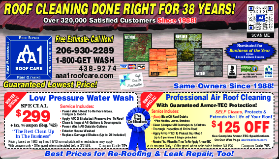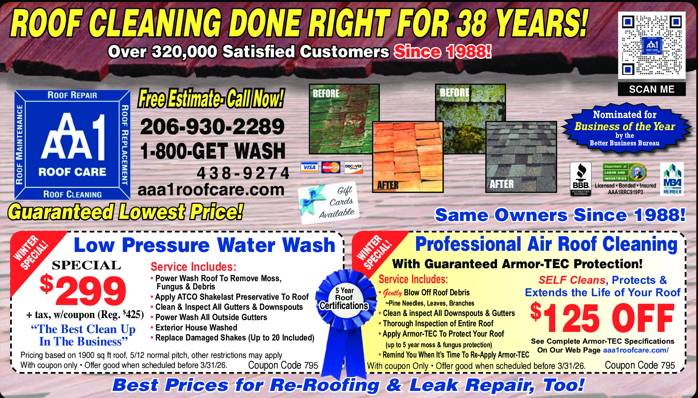 See Complete Armor-TEC Specifications On Our Web Page aaa1roofcare.com. Service Includes: Gently Blo...Morew Off Roof Debris (Pine Needles, Leaves, Branches). Clean & Inspect All Downspouts & Gutters. Thorough Inspection of Entire Roof. Apply Armor-TEC To Protect Your Roof (up to 5 year moss & fungus protection). Remind You When It's Time to Re-Apply Armor-TEC. With coupon only. Offer good when scheduled before 3/31/26. Coupon Code 795 Less