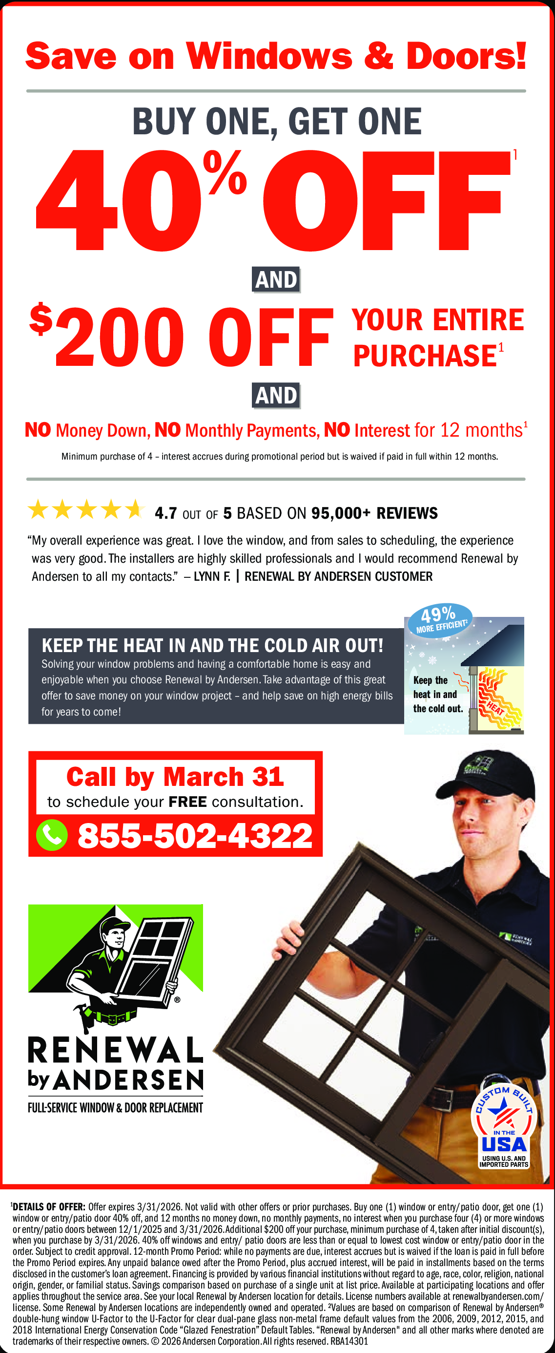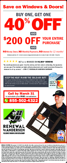 Call by March 31. Minimum purchase of 4 - interest accrues during promotional period but is waived i...Moref paid in full within 12 months. DETAILS OF OFFER: Offer expires 3/31/2026. Not valid with other offers or prior purchases. Buy one (1) window or entry/patio door, get one (1) window or entry/patio door 40% off, and 12 months no money down, no monthly payments, no interest when you purchase four (4) or more windows or entry/patio doors between 12/1/2025 and 3/31/2026. Additional $200 off your purchase, minimum purchase of 4, taken after initial discount(s), when you purchase by 3/31/2026. 40% of Less