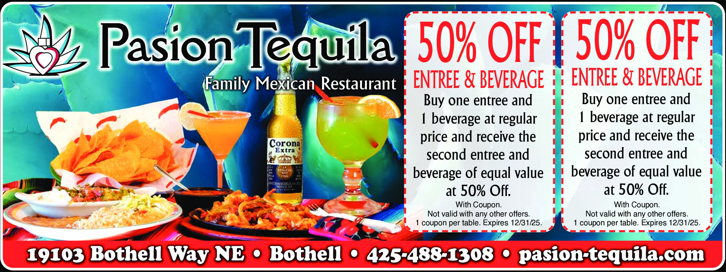 50% OFF Entree & Beverage! Buy one entree and 1 beverage at regular price and receive the second entree and beverage of equal value at 50% off