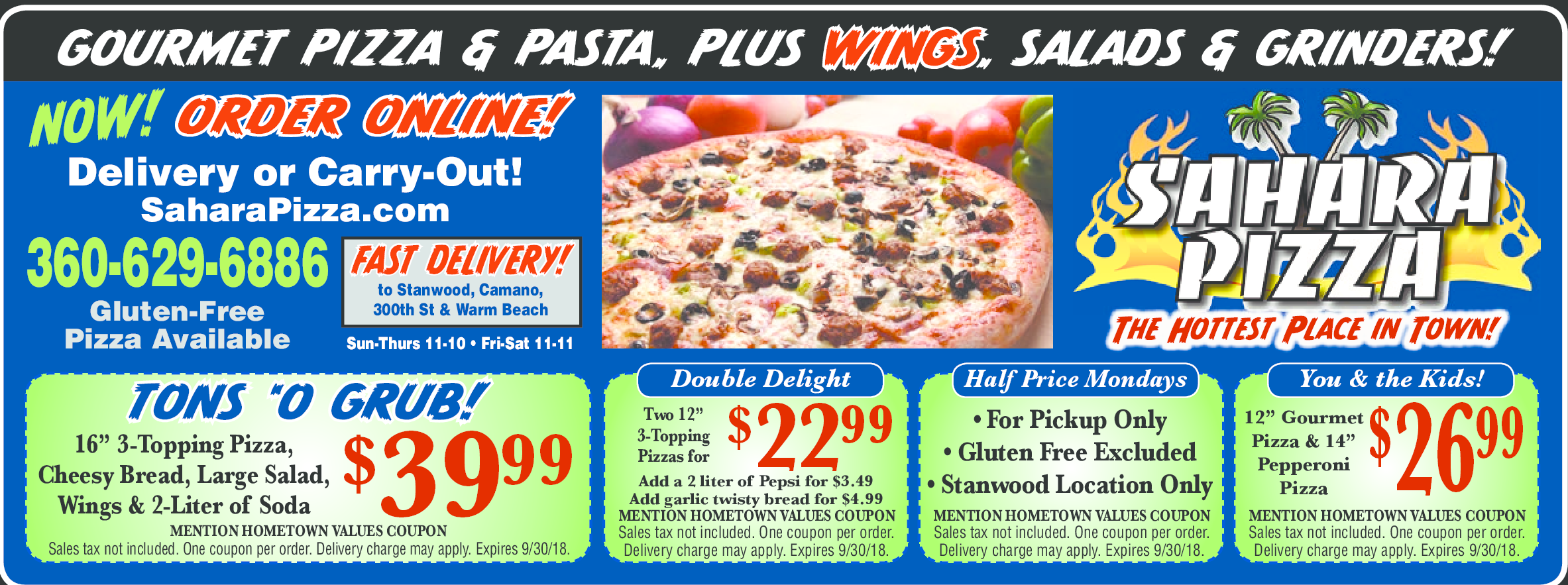 12\" Gourmet Pizza $ 14\" Pepperoni Pizza $26.99 Mention Hometown Values Coupon. Sales tax not included. One per order. Delivery charge may apply. Expires 9/30/18.