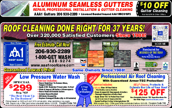 See Complete Armor-TEC Specifications On Our Web Page aaa1roofcare.com. Service Includes: Gently Blo...Morew Off Roof Debris (Pine Needles, Leaves, Branches). Clean & Inspect All Downspouts & Gutters. Thorough Inspection of Entire Roof. Apply Armor-TEC To Protect Your Roof (up to 5 year moss & fungus protection). Remind You When It's Time to Re-Apply Armor-TEC. With coupon only. Offer good when scheduled before 12/31/25. Coupon Code 745 Less