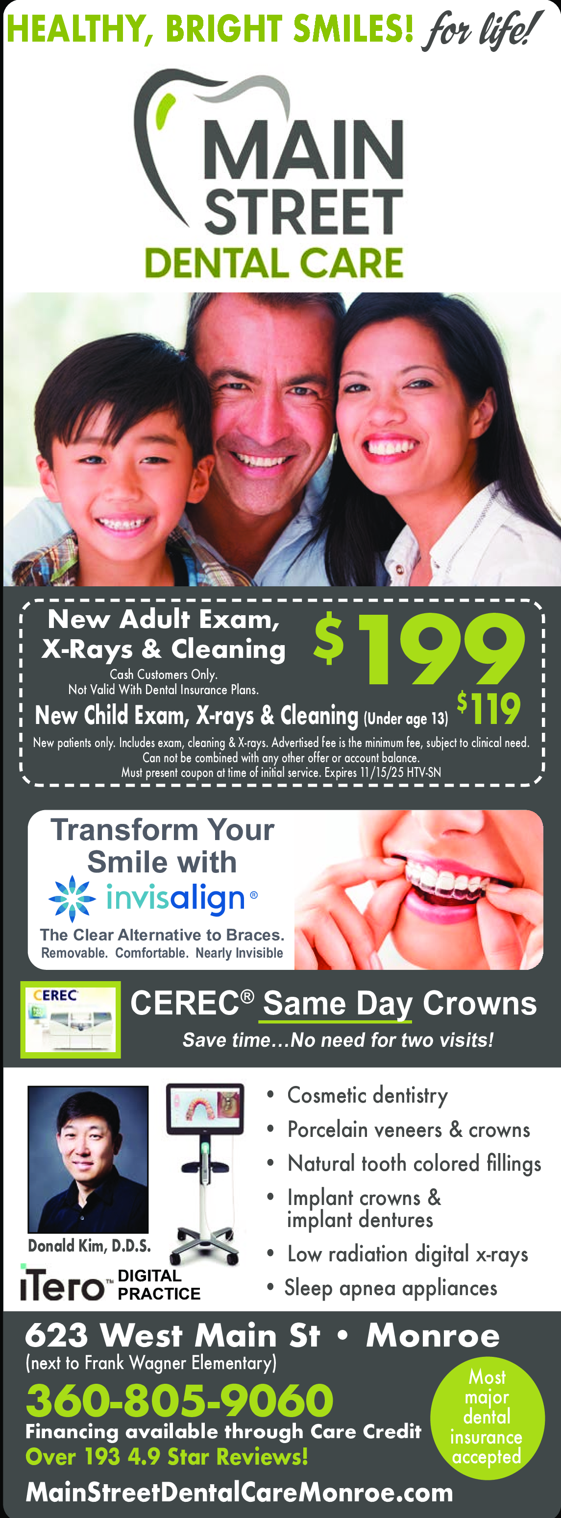 New Adult Exam, X-Rays & Cleaning $199 - New Child Exam, X-Rays & Cleaning (Under age 13) $119