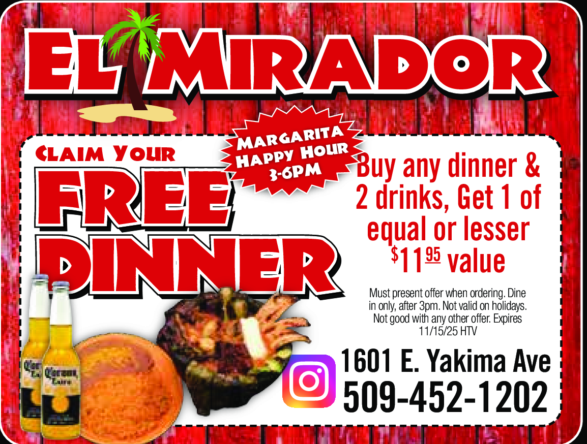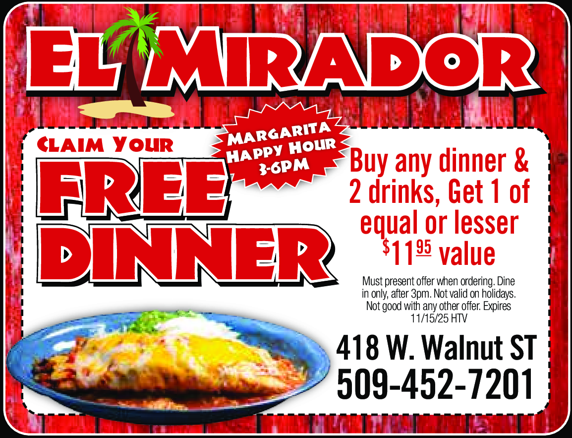 Claim your FREE DINNER! Buy any dinner & 2 drinks, get 1 of equal or lesser $11.95 value