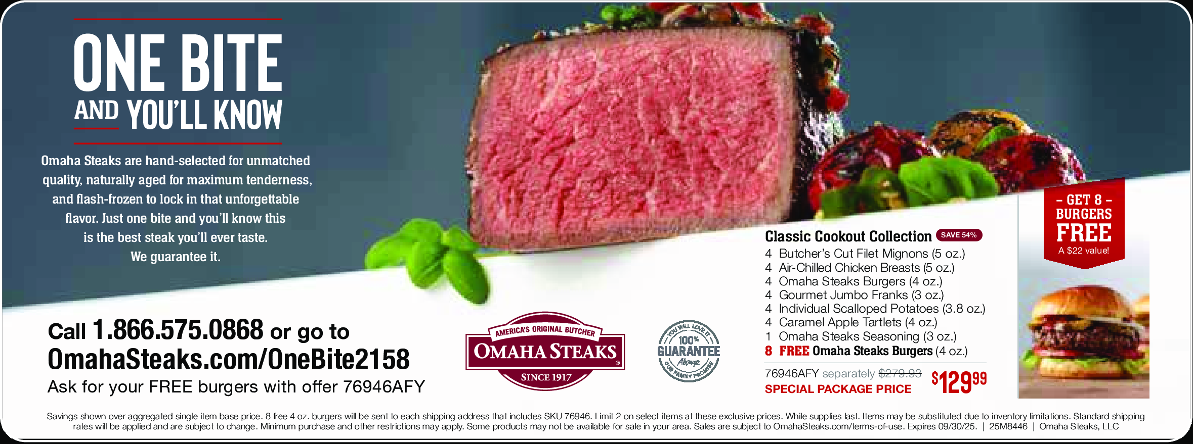 Savings shown over aggregated single item base price. 8 free 4 oz. burgers will be sent to each ship...Moreping address that includes SKU 76946. Limit 2 on select items at these exclusive prices. While supplies last. Items may be substituted due to inventory limitations. Standard shipping rates will be applied and are subject to change. Minimum purchase and other restrictions may apply. Some products may not be available for sale in your area. Sales are subject to OmahaSteaks.com/terms-of-use. Expires 09/30/25. | 25M8446 | Omaha Steaks, LLC Less