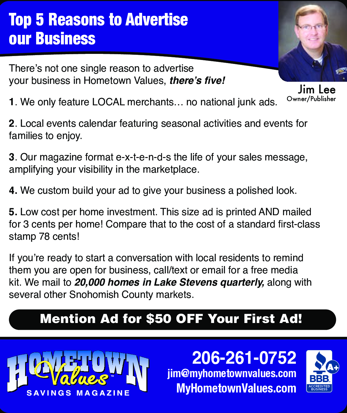 Mention Ad for $50 OFF Your First Ad! Call Jim at 206-261-0752!