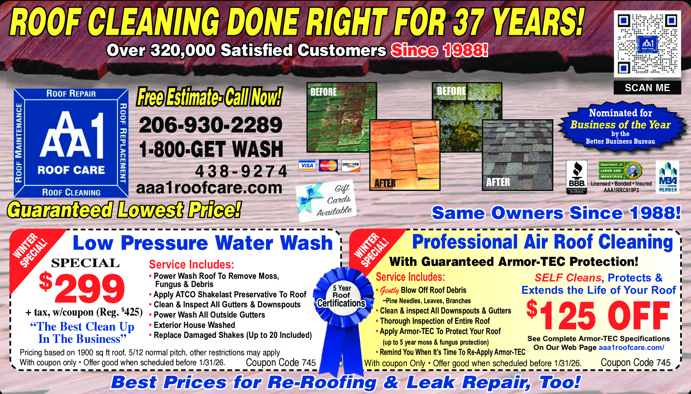 See Complete Armor-TEC Specifications On Our Web Page aaa1roofcare.com. Service Includes: Gently Blo...Morew Off Roof Debris (Pine Needles, Leaves, Branches). Clean & Inspect All Downspouts & Gutters. Thorough Inspection of Entire Roof. Apply Armor-TEC To Protect Your Roof (up to 5 year moss & fungus protection). Remind You When It's Time to Re-Apply Armor-TEC. With coupon only. Offer good when scheduled before 1/31/26. Coupon Code 745 Less