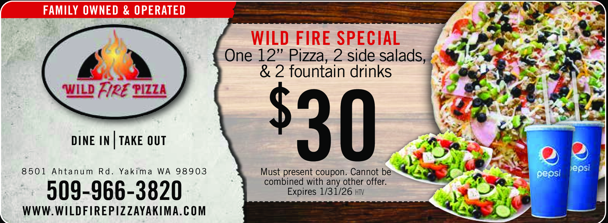 Wild Fire Special! One 12-in Pizza, 2 Side Salads, & 2 Fountain Drinks $30