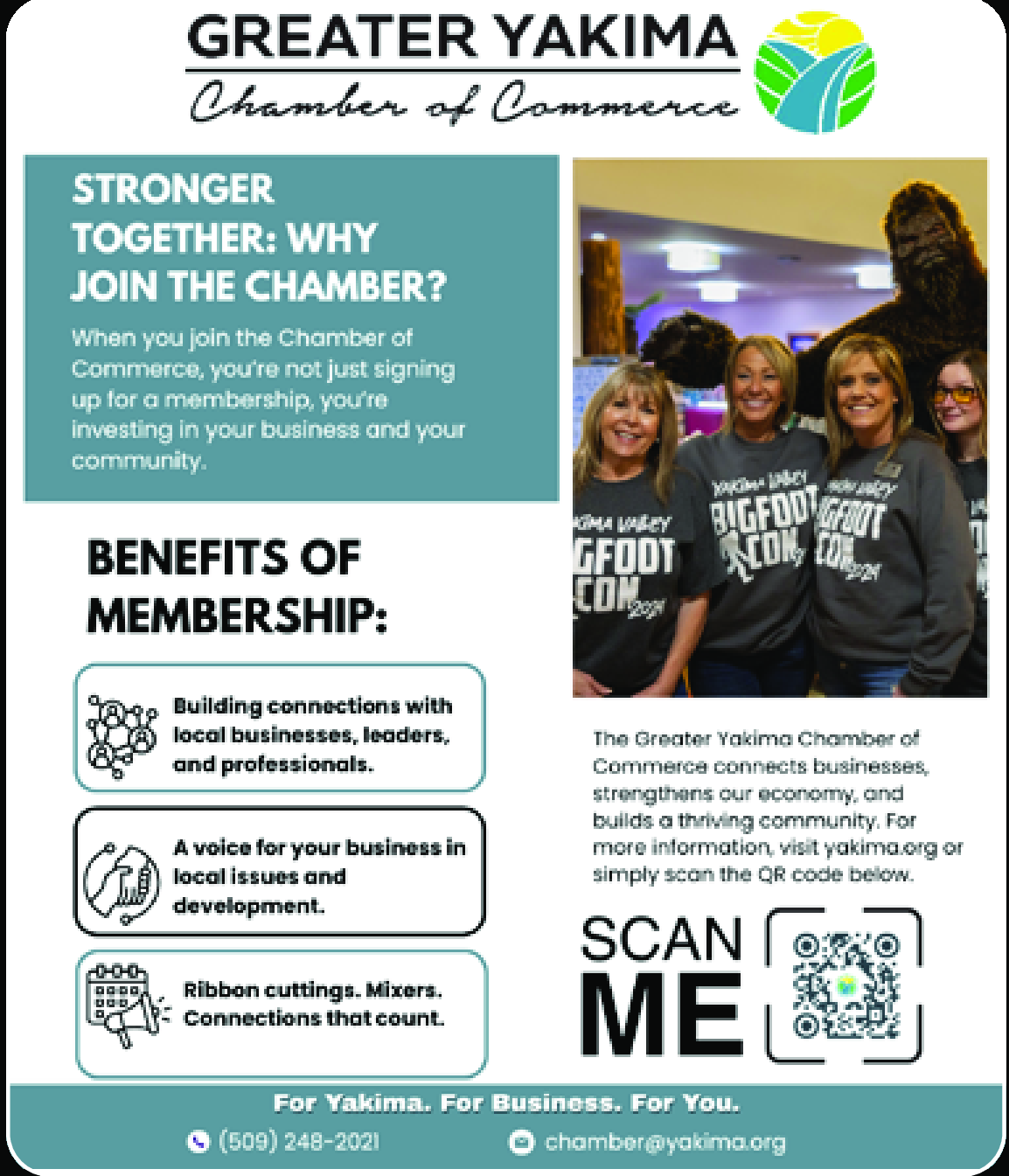 The Greater Yakima Chamber of Commerce promotes pride in our diverse communities through positive, active leadership aimed at creating a cohesive, successful business climate in our County.