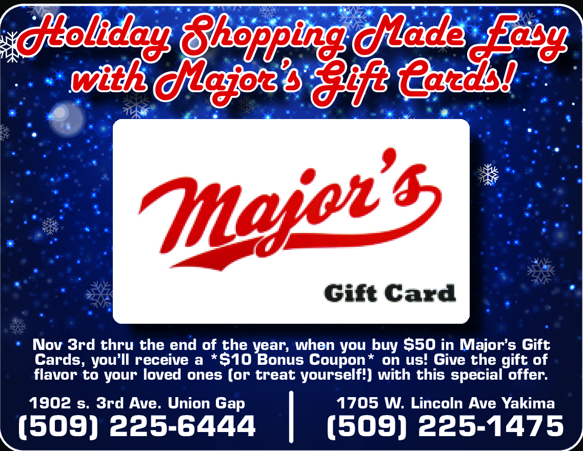 November 3rd thru the end of the year, when you buy $50 in Major's Gift Cards, you'll receive a $10 Bonus Coupon on us! Give the gift of flavor to your loved ones (or treat yourself!) with this special offer