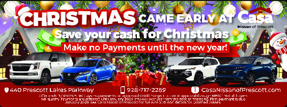 Offer ends 11/30/2025. 90 days no payments on approved credit. Subject to credit approval through NM...MoreAC. Not all buyers will qualify. Payments are deferred until January 2026. Interest accrues from the date of financing. First payment is due January 2026. See Casa Nissan of Prescott for full APR and loan details for qualified buyers. Less