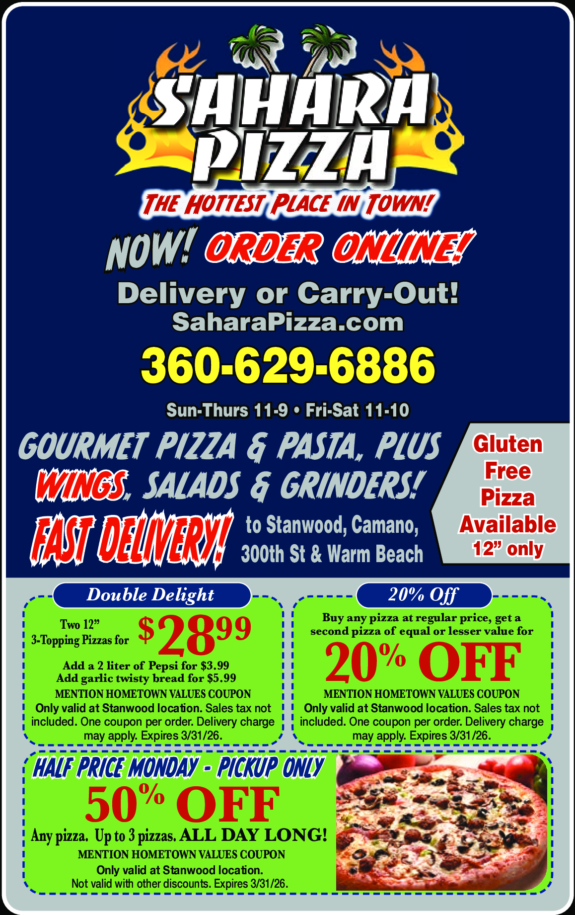 HALF PRICE MONDAY - PICKUP ONLY! 50% OFF Any Pizza - Up to 3 Pizzas - ALL DAY LONG!