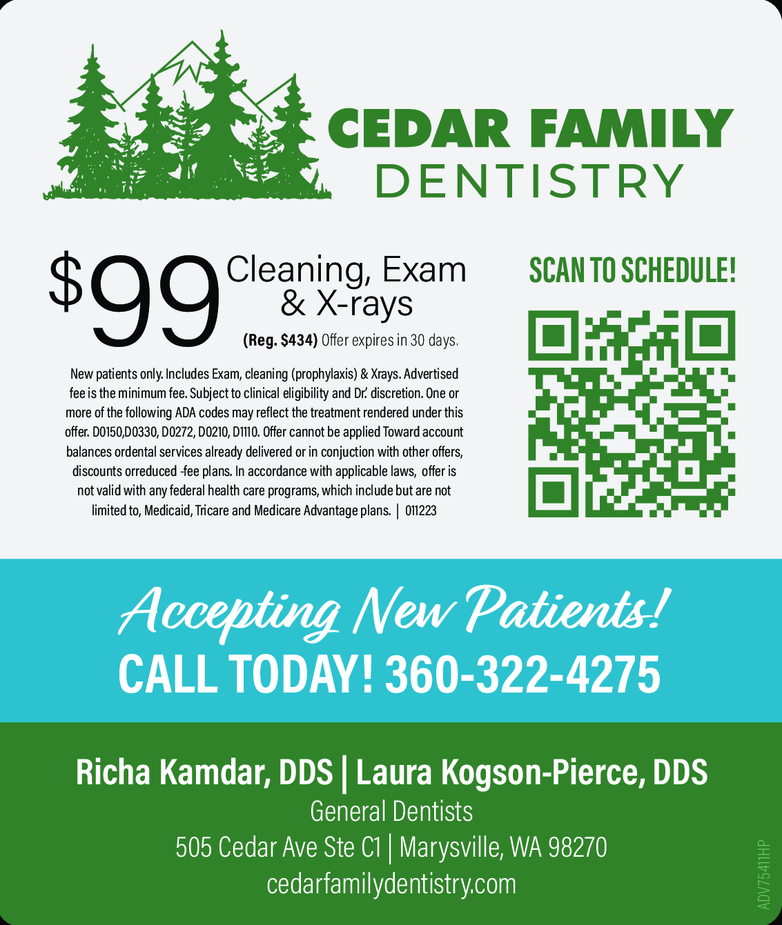 Reg. $434. Offer expires in 30 days. New patients only. Includes exam, cleaning (prophylaxis) & X-ra...Moreys. Advertised fee is the minimum fee. Subject to clinical eligibility and Dr.'s discretion. One or more of the following ADA codes may reflect the treatment rendered under this offer. D0150, D0330, D0272, D0210, D1110. Offer cannot be applied toward account balances or dental services already delivered or in conjunction with other offers, discounts or reduced-fee plans. In accordance with applicable laws, offer is not valid with any federal health care programs, which include but are not limite Less