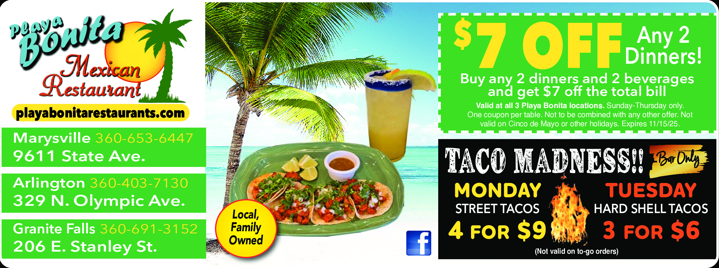 Valid at all 3 Playa Bonita locations. Sunday-Thursday only. One coupon per table. Not to be combine