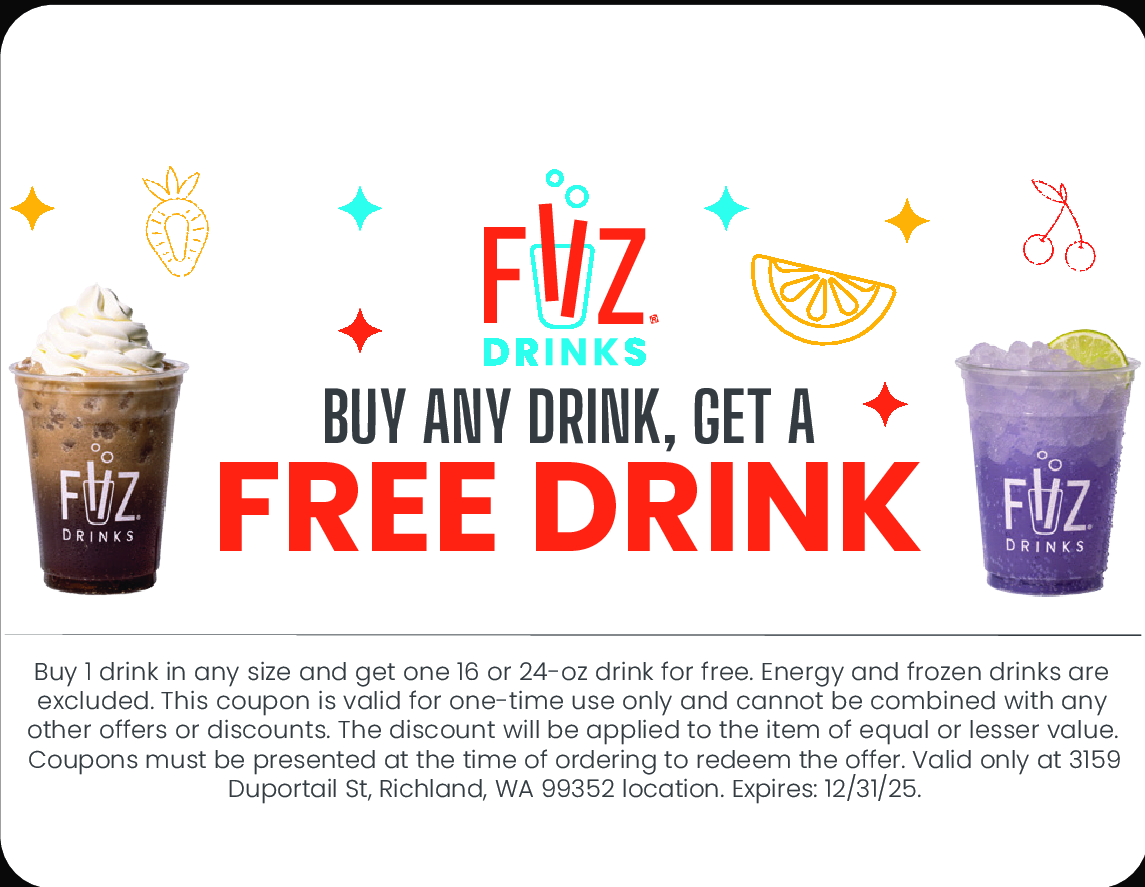 Buy 1 drink in any size and get one 16 or 24-oz drink for free. Energy and frozen drinks are exclude...Mored. This coupon is valid for one-time use only and cannot be combined with any other offers or discounts. The discount will be applied to the item of equal or lesser value. Coupons must be presented at the time of ordering to redeem the offer. Valid only at 3159 Duportail St, Richland, WA 99352 location. Expires: 12/31/25. Less