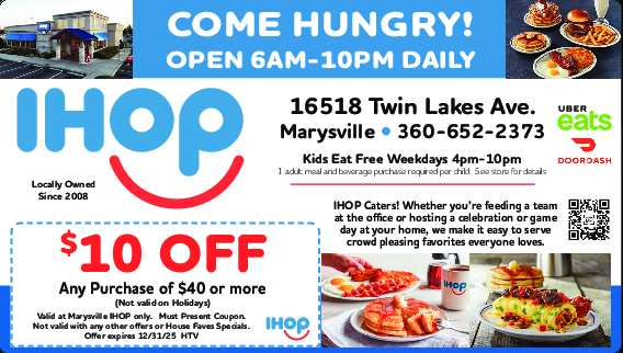 Not valid on Holidays. Valid at Marysville IHOP only. Must present coupon. Not valid with any other