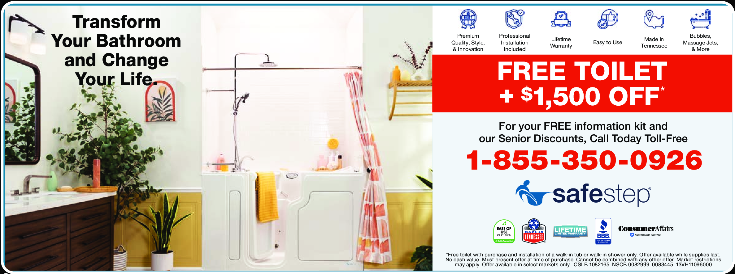 *Free toilet with purchase and installation of a walk-in tub or walk-in shower only. Offer available...More while supplies last. No cash value. Must present offer at time of purchase. Cannot be combined with any other offer. Market restrictions may apply. Offer available in select markets only. CSLB 1082165 NSCB 0082999 0083445 13VH11096000 Less