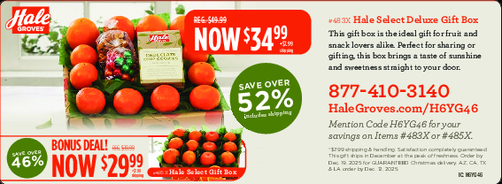 Now $34.99 + $7.99 Shipping - #483X Hale Select Deluxe Gift Box - Call 877-410-3140 or visit HaleGroves.com/H6YG46