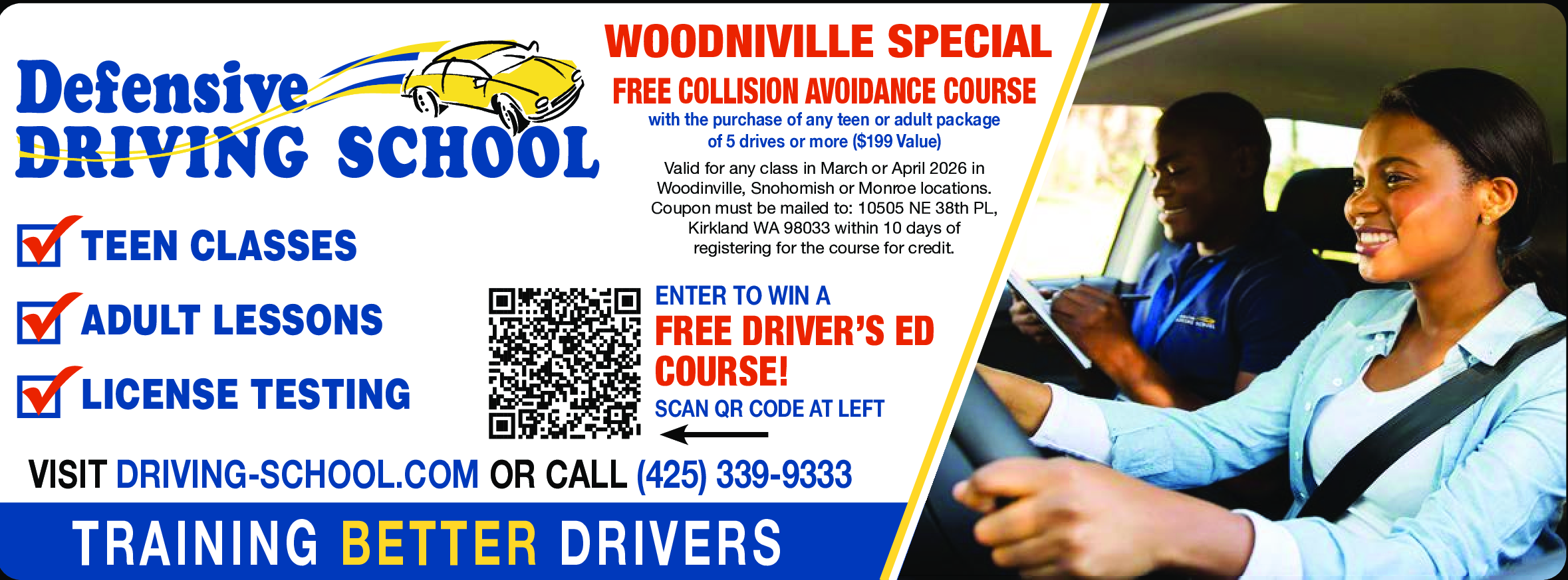 Woodinville Special! FREE Collision Avoidance Course with the purchase of any teen or adult package of 5 drives or more ($199 value)