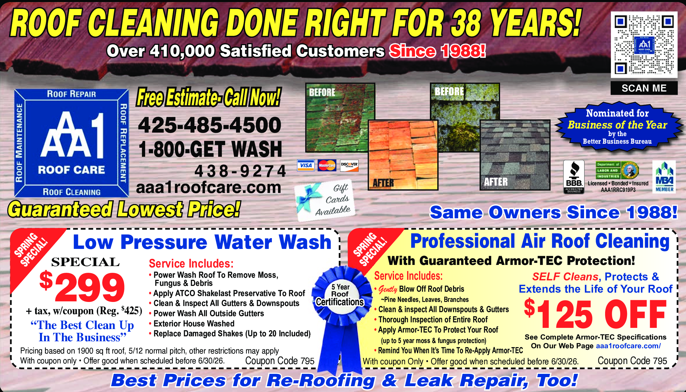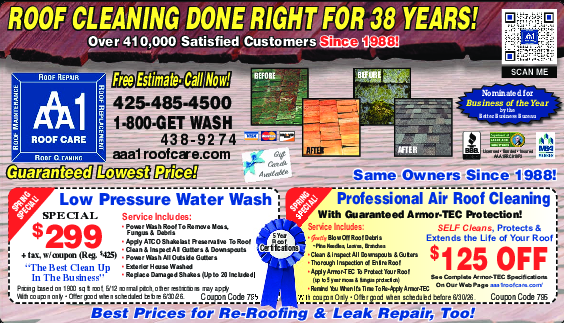 See Complete Armor-TEC Specifications On Our Web Page aaa1roofcare.com. Service Includes: Gently Blo...Morew Off Roof Debris (Pine Needles, Leaves, Branches). Clean & Inspect All Downspouts & Gutters. Thorough Inspection of Entire Roof. Apply Armor-TEC To Protect Your Roof (up to 5 year moss & fungus protection). Remind You When It's Time to Re-Apply Armor-TEC. With coupon only. Offer good when scheduled before 6/30/26. Coupon Code 795 Less