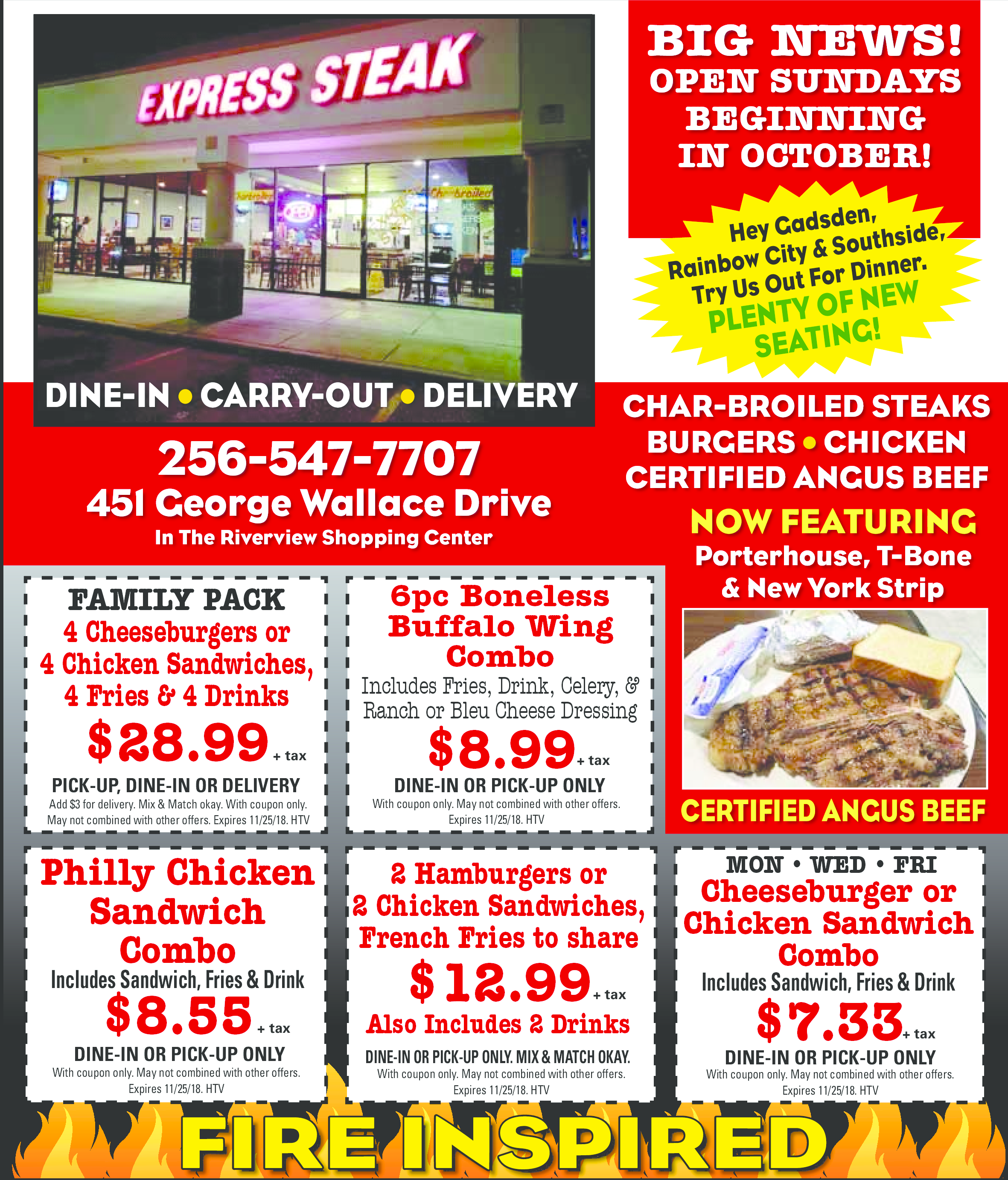 2 hamburgers or 2 chicken sandwiches, french fries to share. Also includes 2 drinks. Pick up, dine in or delivery. Add $3 for delivery. Mix and match okay. With coupon only. May not be combined with other offers. Expires 11/25/18